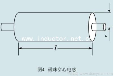 穿心電感的電感量一般都比較小,大約在幾微亨到幾十微亨之間,電感量大小與穿心電感中導(dǎo)線的大小以及長度,還有磁珠的截面積都有關(guān)系,但與磁珠電感量關(guān)系最大的還要算磁珠的相對導(dǎo)磁率 。圖3、圖4是分別是指導(dǎo)線和穿心電感的原理圖,計算穿心電感時,首先要計算一根圓截面直導(dǎo)線的電感,然后計算結(jié)果乘上磁珠相對導(dǎo)磁率 就可以求出穿心電感的電感量。