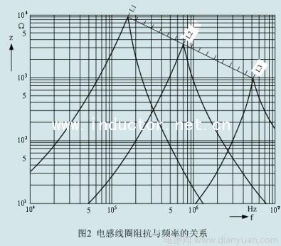 圖2是普通電感線圈的阻抗與頻率的關(guān)系圖,由圖中可以看出,電感線圈的阻抗開始的時候是隨著頻率升高而增大的,但當(dāng)它的阻抗增大到最大值以后,阻抗 反而隨著頻率升高而迅速下降,這是因為并聯(lián)分布電容的作用。當(dāng)阻抗增到最大值的地方,就是電感線圈的分布電容與等效電感產(chǎn)生并聯(lián)諧振的地方。圖中,L1 > L2 > L3,由此可知電感線圈的電感量越大,其諧振頻率就越低。從圖2中可以看出,如果要對頻率為1MHz的干擾信號進行抑制,選用L1倒不如選用L3,因為 L3的電感量要比L1小十幾倍,因此L3的成本也要比L1低很多。